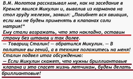 И. Сталин: "Если это спасет жизнь летчика, клапана будем делать из бриллиантов"