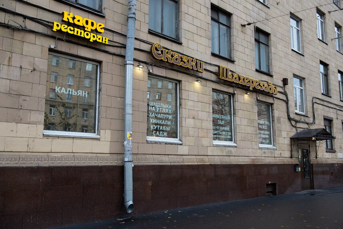 Доброе утро, мои дорогие читатели! Продолжаем наше гастрономическое путешествие! Сегодня в кафе "Сказки Шахерезады"! Хотя смело можно назвать его рестораном. Кафе находится на московском проспекте 193, напротив московской площади, где стоит наш дорогой Владимир Ильич Ленин. Оно расположено сразу на двух этажах жилого дома. Давайте прогуляемся по нему. На цокольном этаже находятся 2 небольших зала. Кафе. 1 ЗАЛ. 2 ЗАЛ. И отдельные кабинки, где можно уединиться. На первом этаже находиться 2 основных зала. Ресторан. 1 Зал. Второй большой зал со своей сценой и музыкальным оборудованием. Думаю по названию кафе вы поняли, что это восточное заведение. Здесь представлена классическая европейская и национальная кавказская кухня. Интерьеры кафе выдержаны в едином стиле. Обстановка дорогая. Стены расписаны по мотивам сказок Шахерезады. Очень красиво и весьма непривычно для наших кафе. Я ещё не видел нигде такого. Восточный стиль здесь по всюду. Начиная от пола и до потолка. Скатерти на с