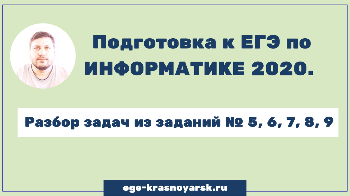 Привет😃🖐🏻 На связи Лоч Игорь - репетитор по информатике Моя страница ВК: https://vk.com/repetitorphysmat124 Разбираем задачку из ЕГЭ по информатике 2020, Задание №5, 6, 7, 8, 9 😎 Хочешь поступить в топовый вуз на бюджет не напрягаясь? 🏆 Смотри видео разбор заданий👇🏻👇🏻👇🏻 Решаем задачи 😜 из ЕГЭ по информатике: https://ege-krasnoyarsk.ru/ #репетитор_по_информатике #репетитор_информатики #репетитор_онлайн #репетитор_по_информатике_Красноярск #репетитор_по_информатике_в_Красноярске #подготовка_к_ЕГЭ_по_информатике #информатика_ЕГЭ #ЕГЭ_информатика #информатика_огэ #информатика #ЕГЭ #ОГЭ #ЕГЭ_2020 #репетитор #репетиторы #репетиторы_Красноярск Курсы подготовки к ЕГЭ, ОГЭ, Олимпиадам. Наш сайт: https://ege-krasnoyarsk.ru Основная группа вконтакте: https://vk.com/repetitor.ege.oge.krasnoyarsk Группа репетитора по физике и информатике: https://vk.com/repetitorpofizikeinformatike Группа репетитора по математике и химии: https://vk.com/repetitorpomatematikeihimii Группа