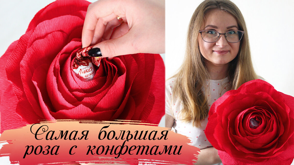 Всем привет! Сегодня будем создавать большую розу из гофрированной бумаги вовнутрь которой поместим конфеты! Конфеты располагаются в самой розе, а также в стебле, что очень оригинально и необычно.