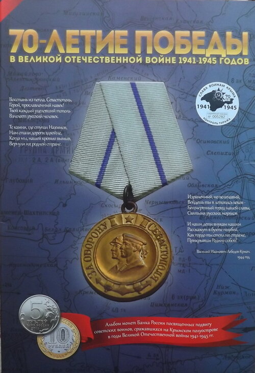 Некоторое время назад я рассказывал о серии монет " Выдающиеся сражения Великой Отечественной Войны", выпущенных к 70-й годовщине Победы. Сегодня поговорим о второй части этой серии под названием "Крымские сражения". К этой части относятся 8 монет: 3 биметаллических монеты номиналом 10 рублей и 5 монет номиналом 5 рублей серии "Крымские сражения". На 10-рублевых монетах изображена официальная эмблема празднования 70-летия Победы ( орден Отечественной Войны), памятник воину - освободителю, установленный в Берлине в Трептов-парке (освобождение мира от фашизма) и скульптура Евгения Вучетича "Перекуем мечи на орала", установленная у здания ООН в Нью-Йорке ( окончание Второй мировой войны). Тираж 10-рублевок - по 5 миллионов экземпляров. Цена их доступна даже начинающим коллекционерам. Комплект из 3-х монет монет стоит от 50 до 100 руб. В серии "Крымские сражения" было выпущено пять 5-рублевых монет: Оборона Севастополя, Оборона Аджимушкайских каменоломен, Керченско-Эльтингенская десантн