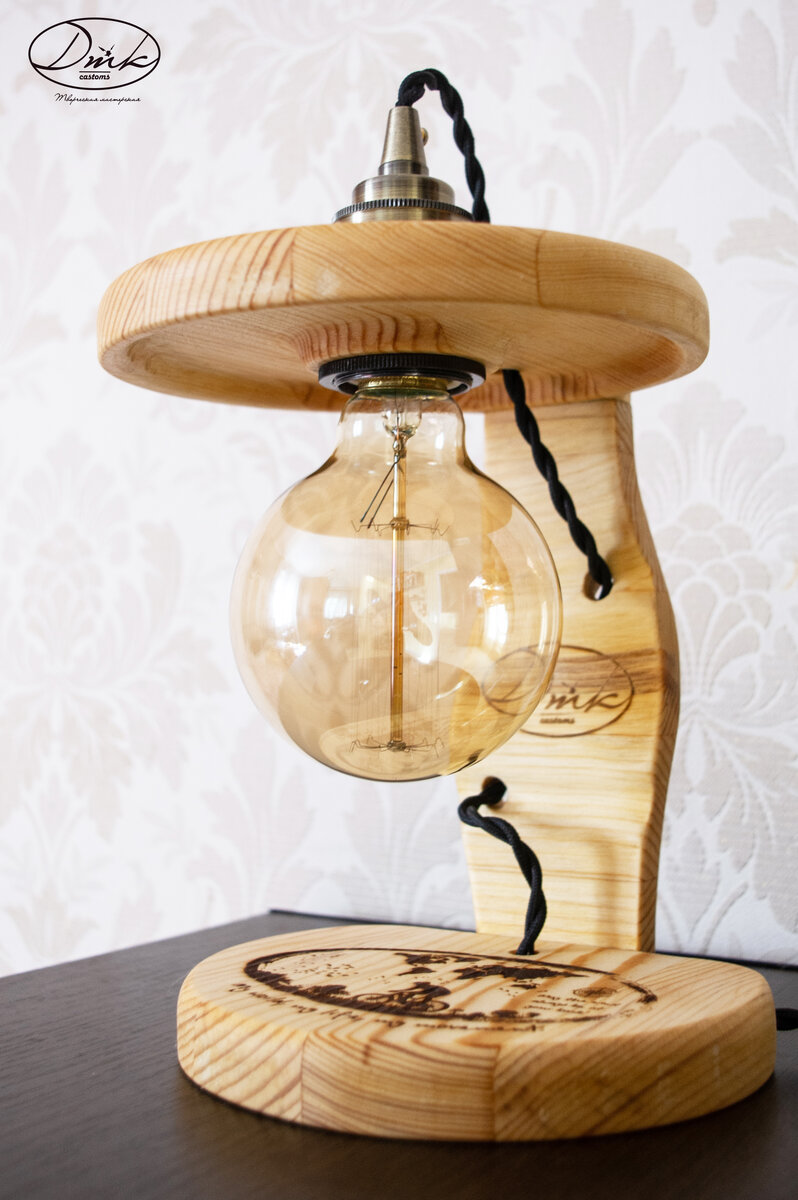 Настольная лампа "Мy world". Настольная лампа двойного назначения. Может быть использована, как настенный светильник. Станет отличным подарком. Материалы - клееная сосна, латунь. Рисунок нанесен методом выжигания. Пропитка льняным маслом, защищающим от влаги, но сохраняющим естественный цвет дерева. Лампа накаливания "Винтаж" 60Вт, дает приятный, уютный теплый свет. Внешний проводной выключатель. Витой шнур "Ретро" , длина 1500мм. Размеры 290х170х180. Лампу можно заказать через группу ВКонтакте https://vk.com/dmkcastoms.