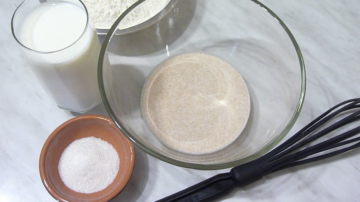 Я начну с блинов на молоке с белой мукой. На первом этапе мне понадобятся закваска-стартер, молоко, сахар, просеянная мука, а затем, когда тесто уже настоится, я добавлю соль и растительное масло.