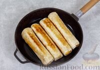 Продукты: Лаваш - 2 листа (160 г) Сосиски - 4 шт. (350 г) Сыр тостовый - 1 упаковка (150 г, 8 ломтиков) Масло растительное - 1 ст. ложка Салат латук (для подачи, по желанию) - 2-3 листа Пошаговый рецепт. Подготовьте все необходимые ингредиенты Листы лаваша разрежьте пополам. Должно получиться 4 полоски шириной, которая соответствует длине сосисок. Если в этом есть необходимость, очистите сосиски от оболочки. По всей длине сосисок сделайте 5-6 неглубоких поперечных надрезов. Смажьте сковороду растительным маслом и разогрейте на среднем огне. В разогретую сковороду выложите сосиски и обжарьте 4-5 минут, с двух сторон, чтобы они прогрелись и слегка подрумянились. Пластинки сыра извлеките из упаковки. На один край полоски лаваша выложите 2 пластинки сыра. На сыр выложите обжаренную сосиску и сверните лаваш в рулет. Повторите процесс с оставшимся лавашом, сосисками и сыром. Вновь разогрейте сковороду, в которой обжаривались сосиски, на среднем огне. Выложите сосиски в лаваше на сковор
