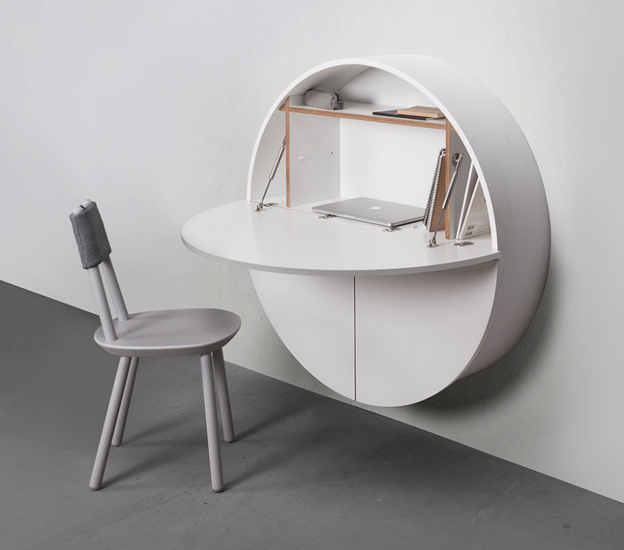 Дизайнеры из Литвы разработали универсальную раскладную мебель для малогабаритных квартир Как обставить квартиру небольшой площади, но при этом не потерять в квадратных метрах? Этот вопрос часто возникает перед владельцами недвижимости. Каждый решает эту проблему по-своему. Одни ставят мебель-трансформер, например, кровать, которая в сложенном состоянии выглядит, как шкаф. Другие идут по пути минимализма и делают своими руками мебель, которую можно собрать без инструментов за пару минут. В связи с этим интересна новинка энтузиастов из Литвы, разработавших раскладной навесной стол-шкаф круглой формы. По замыслу конструкторов, «таблетка» в первую очередь понравится молодым людям, которые ценят своё время, а также семьям, живущим в малогабаритных квартирах. Обладая широким функционалом, стол, изготовленный из фанеры, в сложенном состоянии занимает очень мало места. Чтобы привести конструкцию в рабочее состояние, сначала откидывают полукруглую столешницу, закреплённую на газовых амортизато