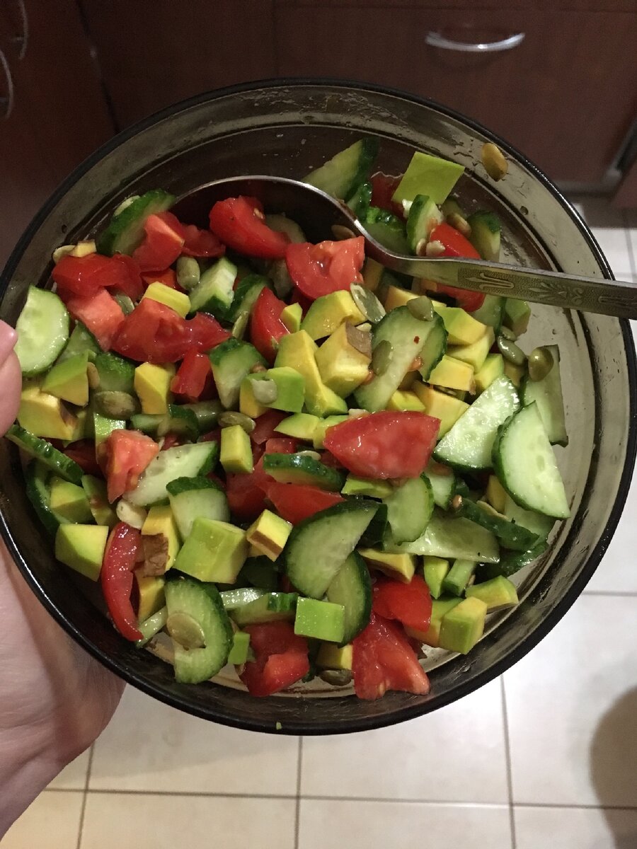 Яркий, сочный, красивый и невероятно полезный салат! Ингредиенты: Приготовление: Овощи моем и сушим. Помидоры и огурцы нарезаем крупными кусочками. Авокадо очищаем от кожи и косточки, нарезаем. Не можете купить спелый авокадо? Купите чуть зеленоватый и оставьте его на тёплой батарее. Через несколько дней он будет мягким, нежным и вкусным! Нарезанные овощи смешиваем в миске, добавляем тыквенные семечки. Солим, перчим. Заправляем кунжутным маслом и перемешиваем. Салат невероятно вкусный. По желанию сюда можно добавить ещё листья салата, сладкий перчик. Я авокадо просто так не очень люблю - для меня он никакой. Но как только я добавляю его во что-то, я сразу начинаю чувствовать его вкус. Такой салатик очень подходит к рыбке или курице. Приятного аппетита :)