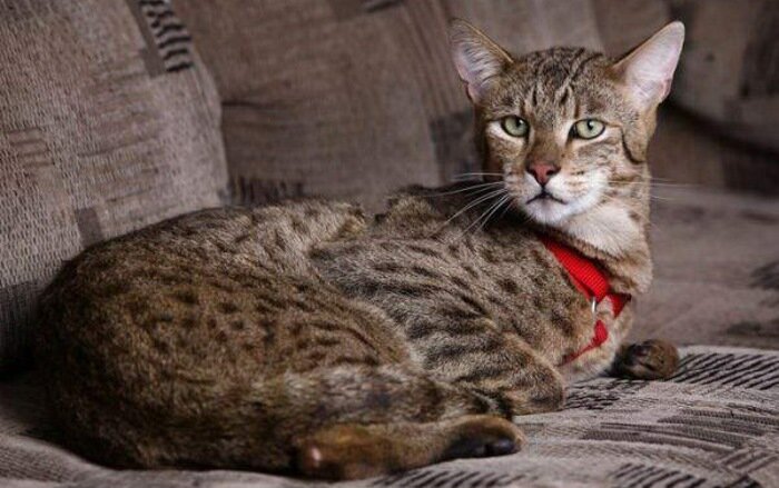 Самой крупной экзотической домашней кошкой, похожей на леопарда считается ашера. Эту породу вывели англичане в 2006 году, смешав гены обычной кошки с генами африканского сервала и азиатского леопардового кота. Породу назвали именем языческого божества – Ашеры. Вес животного может достигать 14–15 кг при длине в один метр. Внешне ашера напоминает сфинкса. Также считается, что представители этой породы не вызывают аллергию. Чтобы приобрести котенка необходимо записываться в очередь. Ждать приходиться около года. Ежегодно английская компания, занимающаяся разведением этой породы, выращивает до 100 особей. Несмотря на высокую стоимость, желающих приобрести самую большую кошку в мире достаточно. Ашера считается идеальным домашним животным любящим спать, тереться об ноги и играть с детьми. Для питания подойдет обычная кошачья пища. Достоинством этой породы считается то, что их можно выгуливать на поводке.