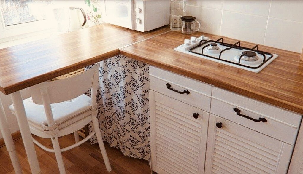 Площадь кухни 5,3 кв.м, по паспорту из БТИ в длину она 2,44 м, и в ширину 2,18 м. Изначально кухня выглядела так: