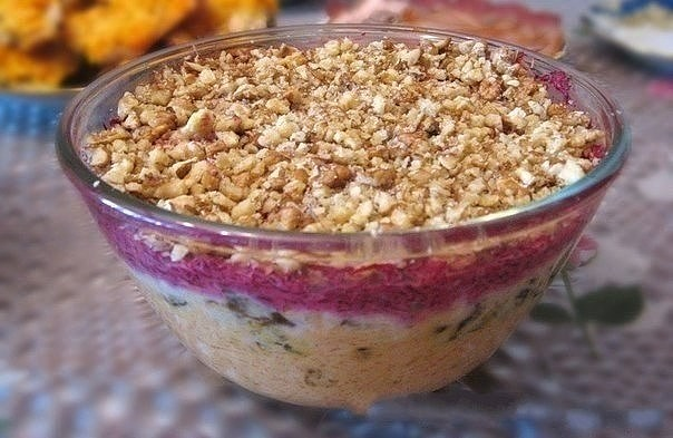 Ингредиенты: Приготовление: Салат укладываем слоями 1 слой: морковь перемешать с чесноком, изюмом и майонезом 2 слой: сыр перемешать с черносливом и майонезом 3 слой: свеклу перемешать с чесноком, орехами и майонезом, посолить этот слой