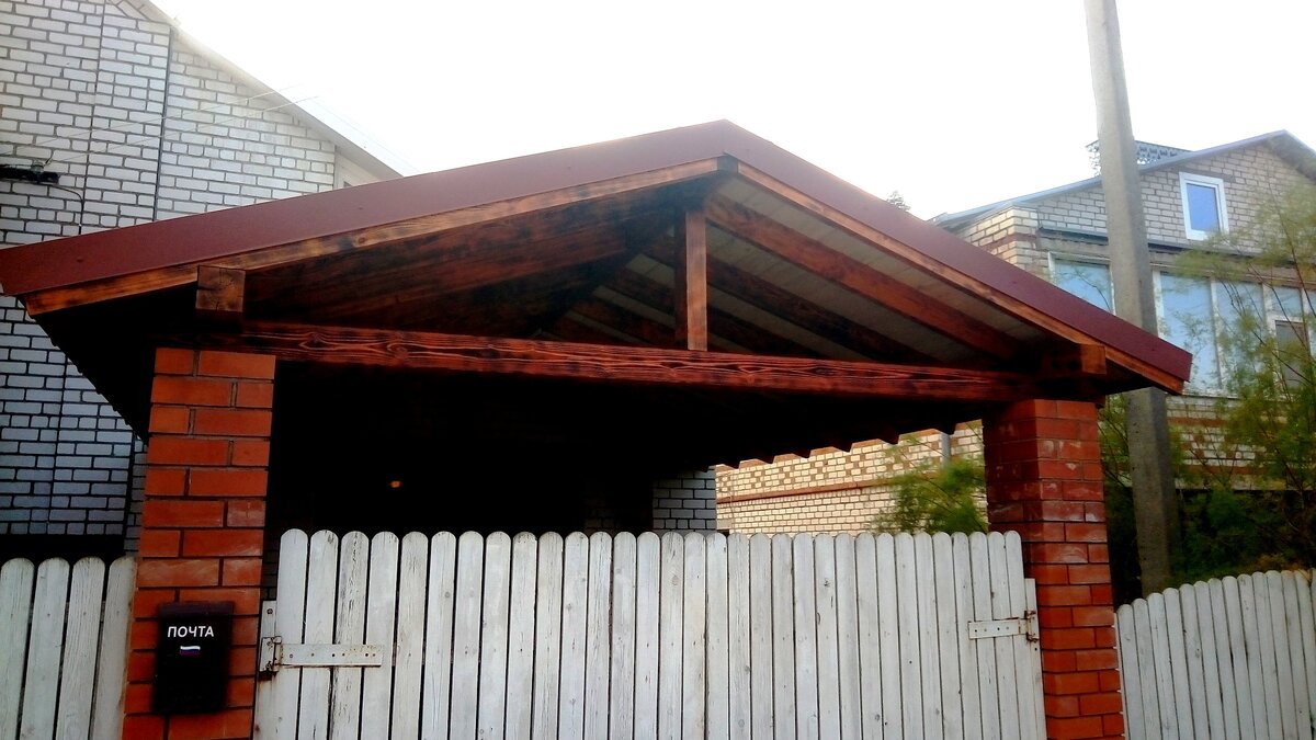 Для защиты автомобиля от дождя, снега, града и других негативных погодных условий решил соорудить классический навес для машины. Каркас выполнен из дерева, крыша из металлочерепицы. Данная конструкция несложная в изготовлении, изготавливается относительно быстро. Работы проводились по выходным и вечерами в течении месяца. Помогала дочь студентка. Размеры - длина 5,5 м, ширина 4,7 м, высота 2,1 м. Для изготовления навеса потребовался брус сосновый 150х150 - 6 шт., 150х100 - 2 шт., 150х50 - 10 шт., 15х25 - 36 шт., металлочерепицы 32 кв.м Стоимость материалов около 50 т.руб. Брус перед сборкой строгается. Для большей защиты от погодных условий и в декоративных целях провёл отжиг бруса газовой горелкой, и пропиткой акриловой цвет махагон. Для соединения применял болты анкерные 8х160, 10х250, 12х300. Для освещения под коньком - лампа светодиодная с датчиком движения. Вот такой навес получился. Если есть вопросы отвечу. Спасибо за внимание.