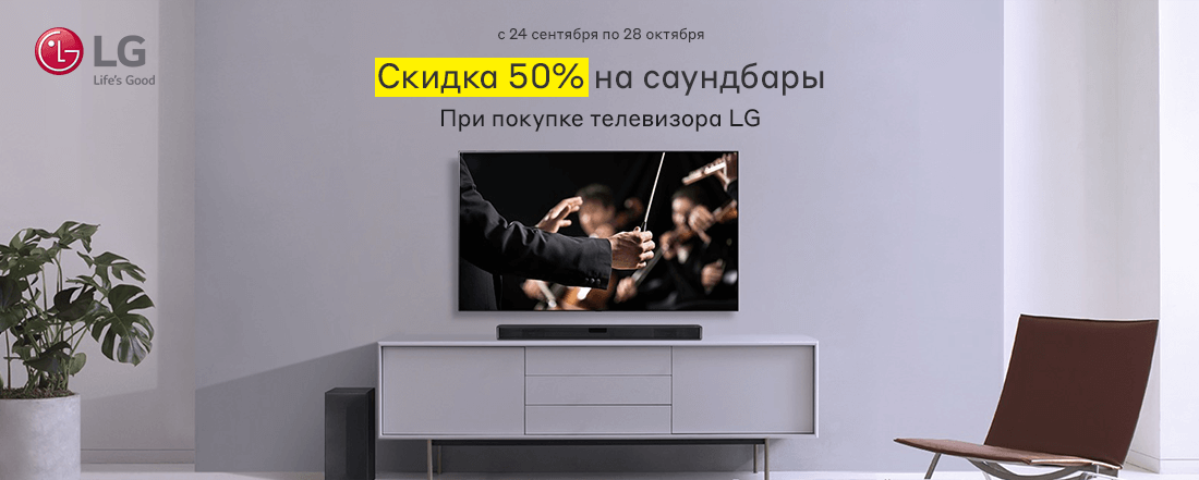 В период с 24 сентября по 28 октября 2019 года включительно во всех магазинах «М.Видео», включая интернет-магазин (покупки, совершённые на сайте www.mvideo.ru), будет проводиться рекламная акция «Скидка 50% на саундбары LG при покупке с акционным телевизором LG». При покупке акционного телевизора LG в розничных магазинах «М.Видео» и интернет-магазине www.mvideo.ru предоставляется скидка 50% на акционный саундбар LG. Выгода предоставляется при оформлении акционного телевизора и саундбара LG в одном чеке.