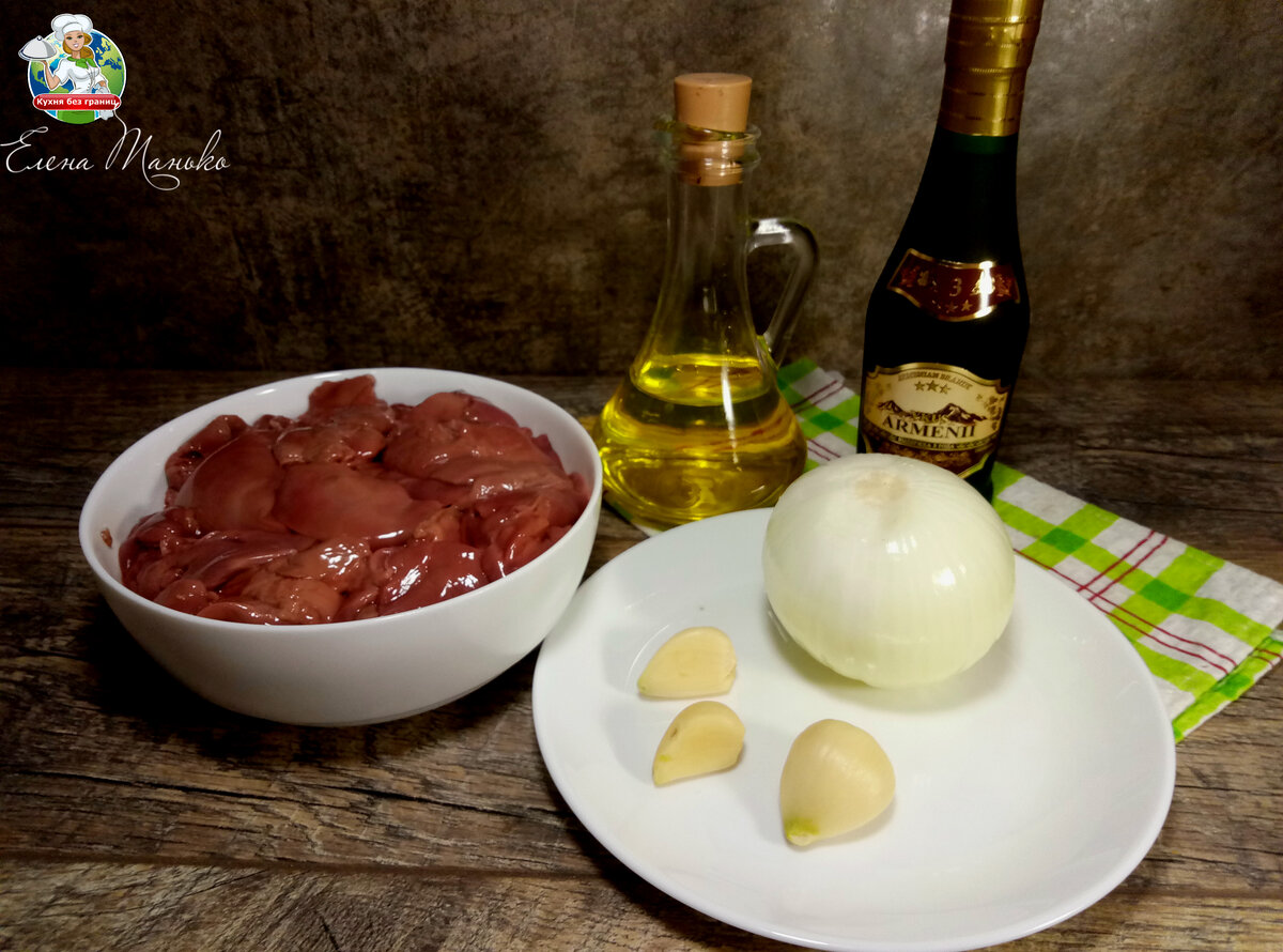 Готовится просто, но чтобы исключить все ошибки я буду рассказывать очень подробно. Приступим. На первом этапе нам понадобится 0,5 кг куриной печени, 3 зубочка чеснока, 1 луковица, 50 мл подсолнечного масла, 50 мл коньяка. В базовом французском рецепте коньяк нужно поджечь, чтобы коньячный спирт выгорел. Но я этого не делала, а просто подерж