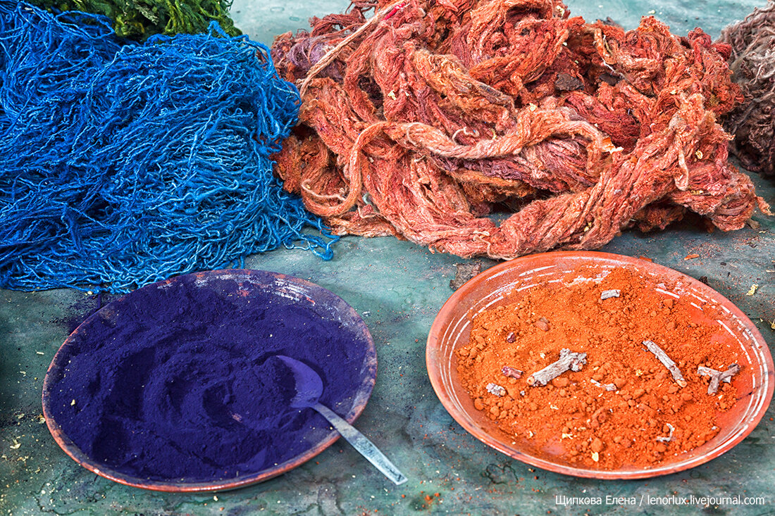 Халим знает о красках все. Тут, в Маргилане, на фабрике Yodgorlik он царь и бог в покраске нежнейшего шелка. Мы идем по владениям Халима, слушаем его рассказ, разглядываем тарелки с разноцветными порошками, тут же рядом мешочки с сушеными травами, корочками граната и прочей ботаникой. Порошки на тарелках - это краски, натуральные. Работать с ними сложнее, чем с химическими, но живые краски Халим любит больше и уже не один десяток лет колдует с сочетанием цвета и пропорциями, для получения самых невероятных оттенков. Процесс покраски ткани одновременно прост и сложен. Приготовленный к окрашиванию шелк нужно намочить, а потом в несколько раз сложить и особым образом завязать. Дальше в раствор краски опускается завязанный кусочек, когда шелк впитает в себя нужное количество краски, его тщательно выполаскивают, снова складывают, завязывают и все начинается заново. Вот так и получаются совершенно необычные узоры, каждая ткань уникальна, двух похожих найти не удастся. Каким выйдет рисун