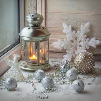 Еще одна замечательная задумка - объединить белый фонарик с украшениями в серебристо-синей гамме. Елочные шары, изящная снежинка, нежная гирлянда, бант и бусы - все это чудесно сочетается между собой на фоне хвойных лапок и шишек.