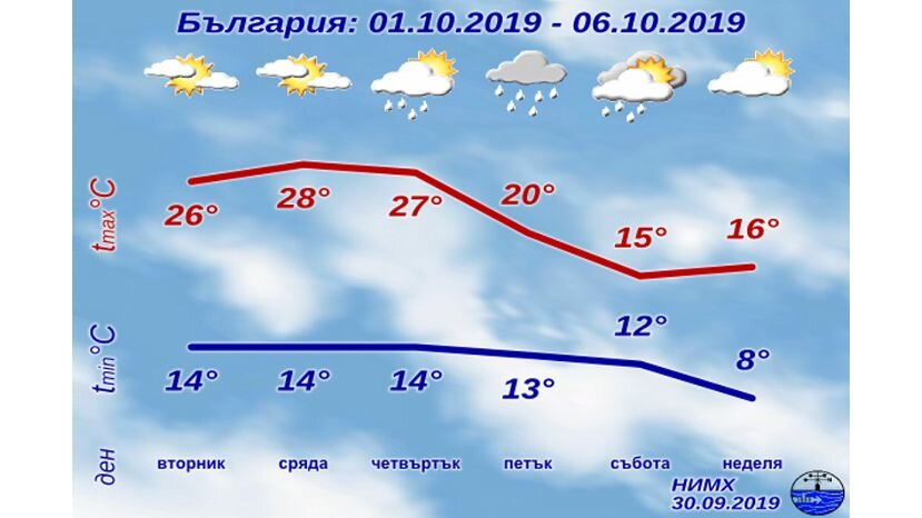 Сегодня будет солнечно со слабым северо-западным ветром, в Восточной Болгарии – с южным ветром. Максимальная температура будет между 27° и 32°, в Софии – около 27°... В конце недели температура в Болгарии начнет понижаться
