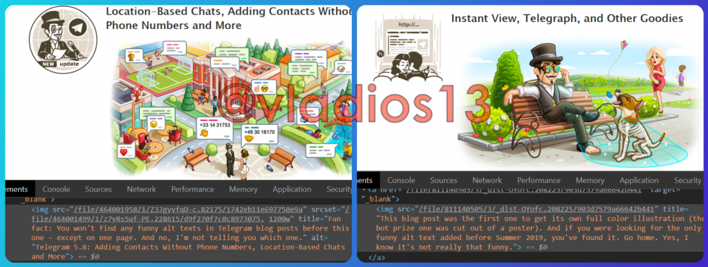 Все мы знаем какие красивые делает постеры Telegram к своим обновлениям. Так не давно, начиная с версии 5.8. Telegram стал прятать в описание изображения скрытый «alt-text«. В постере было сказано: Интересный факт: смешных альт-текстов в сообщениях на блоге Telegram до этой версии вы не найдете — кроме как на одной из страниц. И нет, я не скажу тебе, на какой именно. Недолго думая я отправился на поиски, что бы найти самый первый скрытый текст. И нашел я его, аж с версии 3.14 где было сказано: Этот пост был первым, кто в блоге получил свою собственную полноценную цветную иллюстрацию. И если вы искали единственный смешной альтернативный текст, добавленный до лета 2019 года, вы нашли его. Идите домой. Да, я знаю, что это не так уж и смешно. Telegram канал