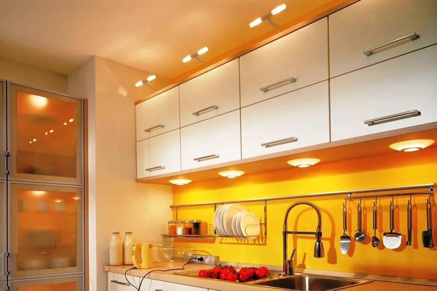 Нередко во время кулинарных работ человек загораживает собственной спиной центральный свет, а дневного может быть недостаточно. Значит, требуется дополнительная подсветка — яркая, чтоб готовящий пищу видел, что делает, но в то же время не бьющая в глаза.