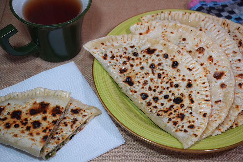 БЖУ на 100 грамм блюда: Б - 8,5 г; 7,7 г; У - 30,1 г; 222,8 Ккал. Ингредиенты: Для теста: - мука - 220 г; - соль - 0,5 ч.л.; - теплая вода - 100 мл - растопленное сливочное масло смазать лепешки. Для начинки: - лук зелёный - 60 г; - укроп - 15 г; - чеснок - 5 г; - растительное масло - 10 мл; - соль, черный молотый перец по вкусу. Способ приготовления: Готовим начинку Зелень моем и мелко шинкуем, чеснок пропускаем через пресс и обжариваем все на растительном масле 2 - 3 минуты. После того как зелень немного остынет добавляем к ней натёртый сыр, соль и специи. Готовим тесто Муку, воду и соль смешиваем до образования упругого, пластичного теста, которое мы раскатываем в блин толщиной не более 2 мм. Затем с помощью формы вырезаем кружки из теста диаметром +- 15 см. Формируем лепешку