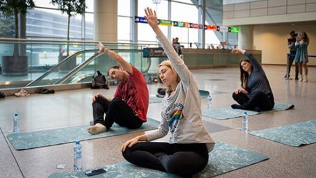 Комплекс упражнений и дыхательных практик перед полетом пассажирам показали тренеры Yogic project на первом этаже атриума прилета международных авиалиний.