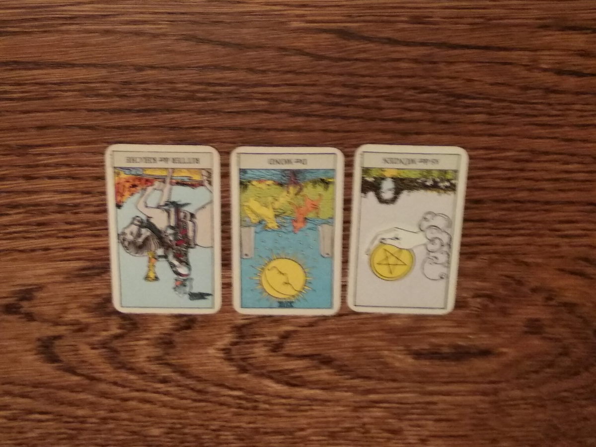 Карты в раскладе: Перевернутый Рыцарь Кубков, Перевернутая Луна и Первернутый Туз Пентаклей.
