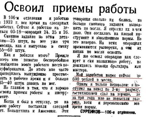 Когда говорят о тридцатых годах в СССР, то в зависимости от взглядов человека, могут возникнуть разные ассоциации.Для кого-то это время лагерей, беспросветного террора и тотальной диктатуры. А кто-то вспомнит о том, что тогда быливеликие стройки, возведение индустриальных гигантов, которые до сих пор являются синонимами крупных индустриальныхдостижений. Было время духовного подъёма, веры в то что будущие поколения будут жить лучше родителей. Да, жилосьпростому народу непросто. Но, результаты труда уже были наглядно видны.В одной статье невозможно описать все процессы того времени. Потому уделим внимание только вопросу цен и зарплат.Энтузиазм, великие стройки-это замечательно. Но, как жилось народу ? Что можно было купить на заработанные деньги ?Сначала рассмотрим зарплаты и доходы разных категорий советских граждан. Чтобы не быть голословным будут приводитьсядокументы той эпохи.Начнём с рабочих специальностей. Зарплата слесаря третьего, т.е. низкого разряда, согласно заметке в газет