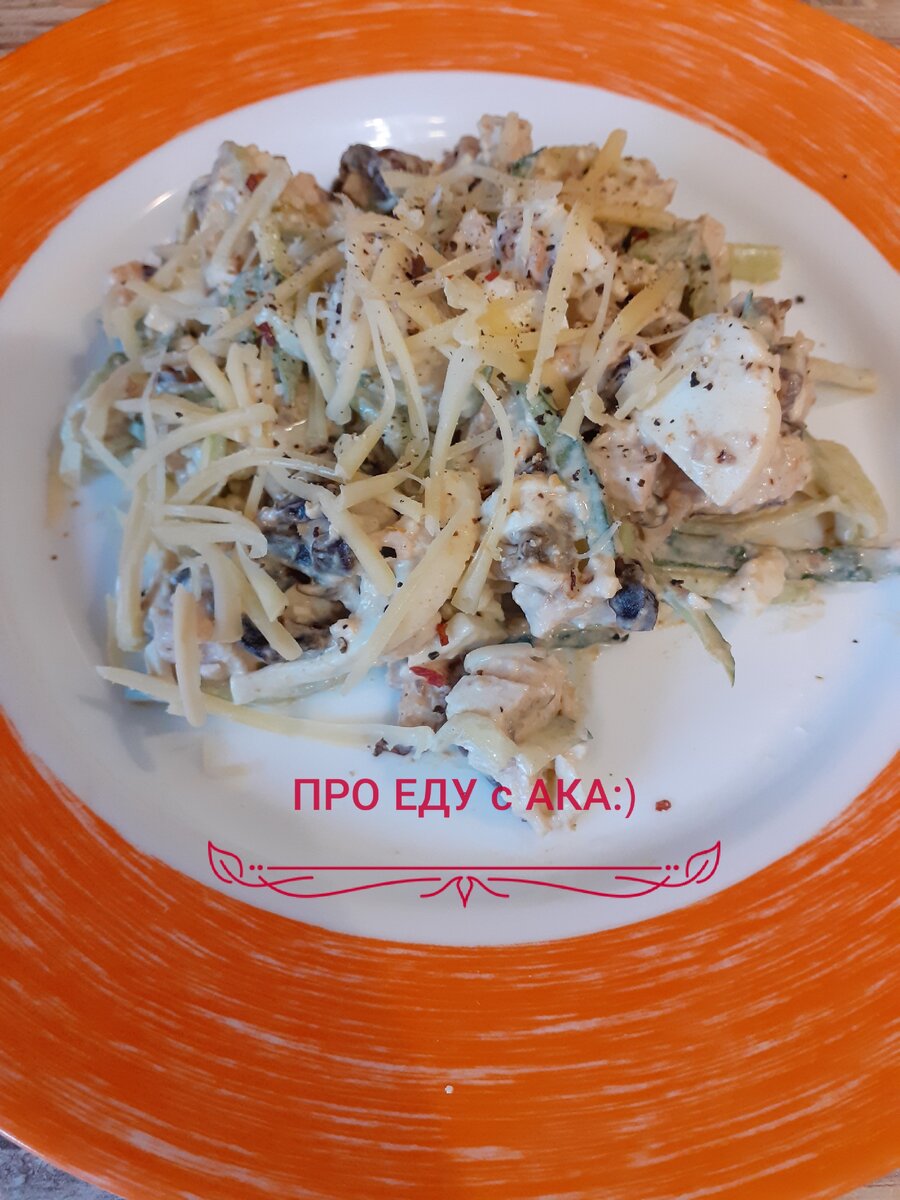 Невероятный дуэт нежнейшего куриного мяса и чернослива , дополняет свежий огурчик и пикантный грецкий орех! Соус венчает это творение и погружает нас в атмосферу наслаждения !