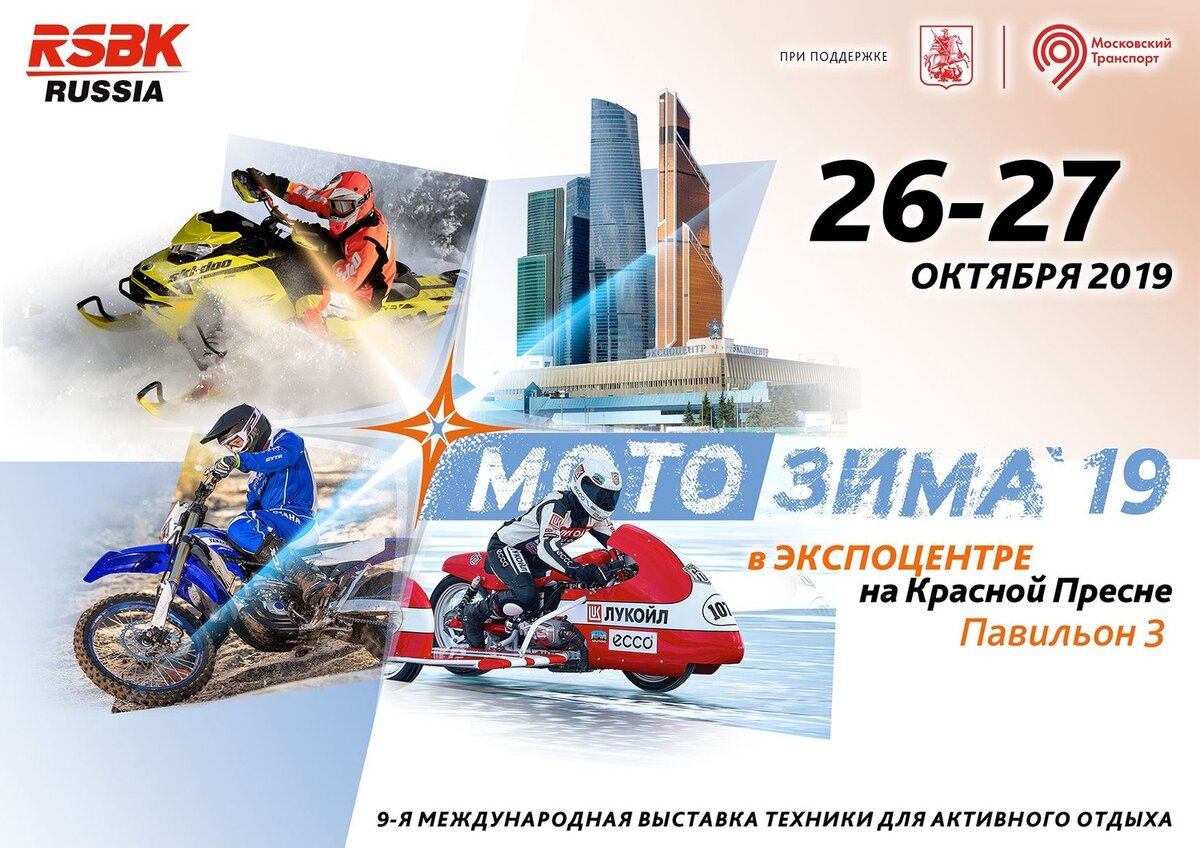 WWW.IN-MOTO.RU «Мотозима-2019» – выходные в “Экспоцентре”! Девятая международная выставка техники для активного отдыха «Мотозима–2019», 26–27 октября, ЦВК ”Экспоцентр”. “Мотозима” – крупнейшее мотоциклетное мероприятие осени. Выставка проходит в последние выходные октября, когда московские мотоциклисты закрывают сезон. Она становится последним аккордом перед длительным затишьем, хорошей возможностью подобрать всё необходимое для зимнего обслуживания, ремонта и тюнинга, а также задуматься об обновлении личного мотопарка. За время существования “Мотозимы” в ней принимали участие такие гиганты мировой и российской мотопромышленности, как BMW, Harley-Davidson, KTM, Yamaha, Honda, Kawasaki, Ducati, Aprilia, Indian, Triumph, BRP, Polaris, Bajaj, Ирбитский мотозавод, Русская Механика, Stels и другие. Проходили российские и европейские премьерные показы новейших моделей. В этом году вновь ожидается представительный состав участников с новейшими мотоциклами, квадроциклами, снегоходами, скуте
