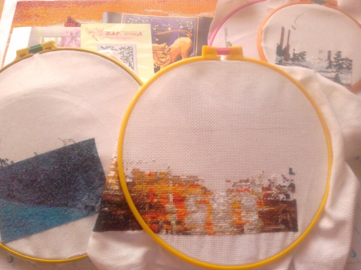 Сегодня первое октября. И я начну серию публикаций о своих текущих работах. Их у меня восемь. Две мозаики и шесть вышивок. Начну, пожалуй, с алмазной мозаики. Первая картина размером 40 на 50 сантиметров, круглыми стразами. Выкладывается очень легко. Большие цветовые пятна позволяют использовать насадки на стилус. В основном пользуюсь той, что на три стразика. Вторая алмазная мозаика 50 на 50 сантиметров, стразы квадратные. Выложен небольшой кусочек. Я не тороплюсь с этой работой. Двигаюсь потихоньку, в основном пинцетом. Пока идет фон, который выполнен в темных цветах и ничего не понятно. А еще у меня шесть вышивок. Так получилось, что наборов и подборов по схемам из интернета равное количество - по три штуки. Сначала покажу наборы. Их я вышиваю так, как указал производитель в инструкции. Первую картинку я взяла для того, чтобы попробовать полную зашивку. Но пока она до меня добралась, я уже поняла, что, как и в алмазной мозаике, мне не очень нравится частичный рисунок. Все равно сд
