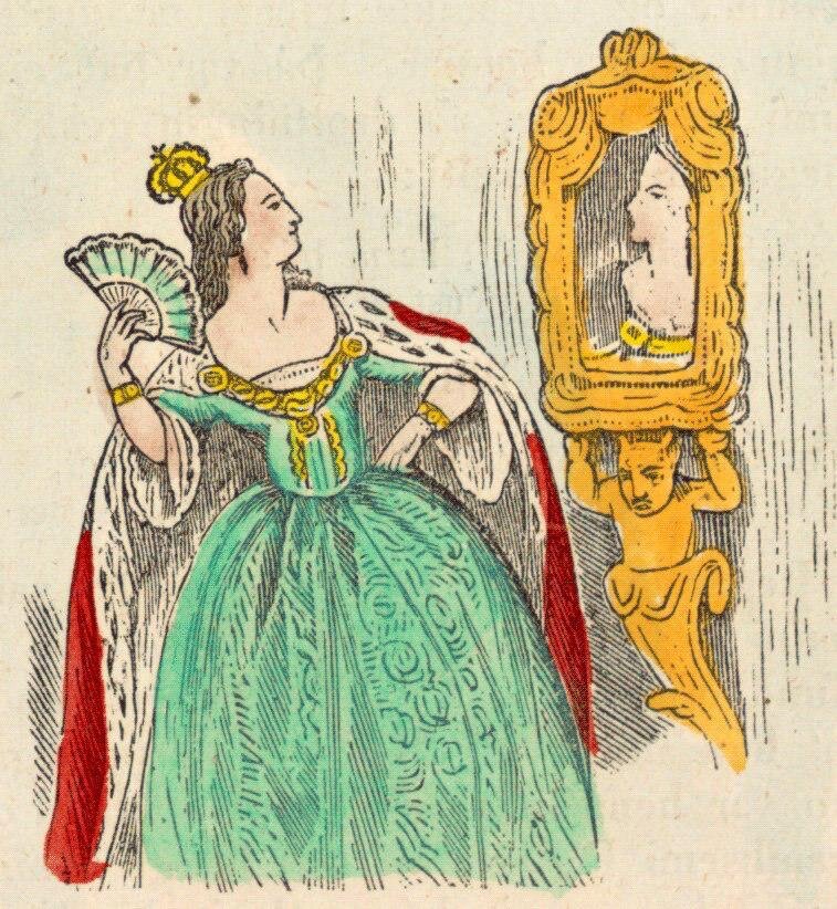 В изданном в 1852 году исландском переложении "Белоснежки" с иллюстрациями Теодора Хосеманна королева поразительно похожа на Екатерину II. Что ж, хороший штрих к российско-датским отношениям. Исландия тогда по результатам датско-норвежской унии входила в состав Дании. О дружбе России с Данией говорит хотя бы то, что в 1864 году наследник русского престола сделает предложение датской принцессе. Но и Екатерина II не могла не остаться в народной памяти, так как решила крупнейший в XVIII веке земельный конфликт в Европе - если при Екатерине I и Петре III Россия стояла на пороге датской войны, которая не случилась из-за дворцового переворота, то Екатерина II от имени своего сына передала спорное готторпское наследство, т.е. Шлезвиг-Гольштейн, Дании, а Павел I присоединил к щедрому жесту еще и Ольденбург с Дельменхорстом в Северо-Западной Германии - получилась интересная схема передачи огромнейших владений родственнику Екатерины II, причем не факт что в интересах России.