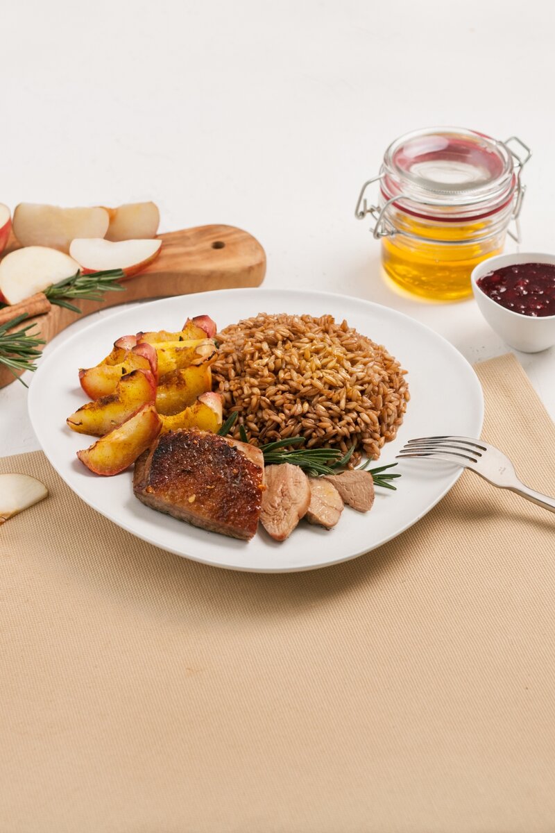 Утка с яблоками – это классика. Предлагаю подать её с полбой. Если добавить в полбу вытопленный утиный жирок, то вы откроете для себя новое звучание этой крупы и секрет французского искусства! 😉 ______________