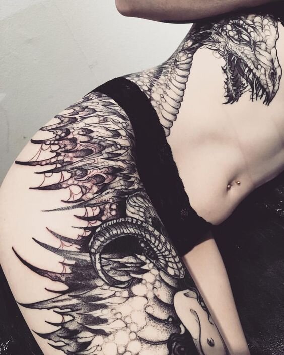 Если дракончик с когтями и клыками – указывает на скрытую агрессию и наоборот, если дракон на татуировке лежит в миролюбивой позиции со сложенными крыльями, то это значит, что девушка уравновешена и доброжелательна ко всем окружающим.