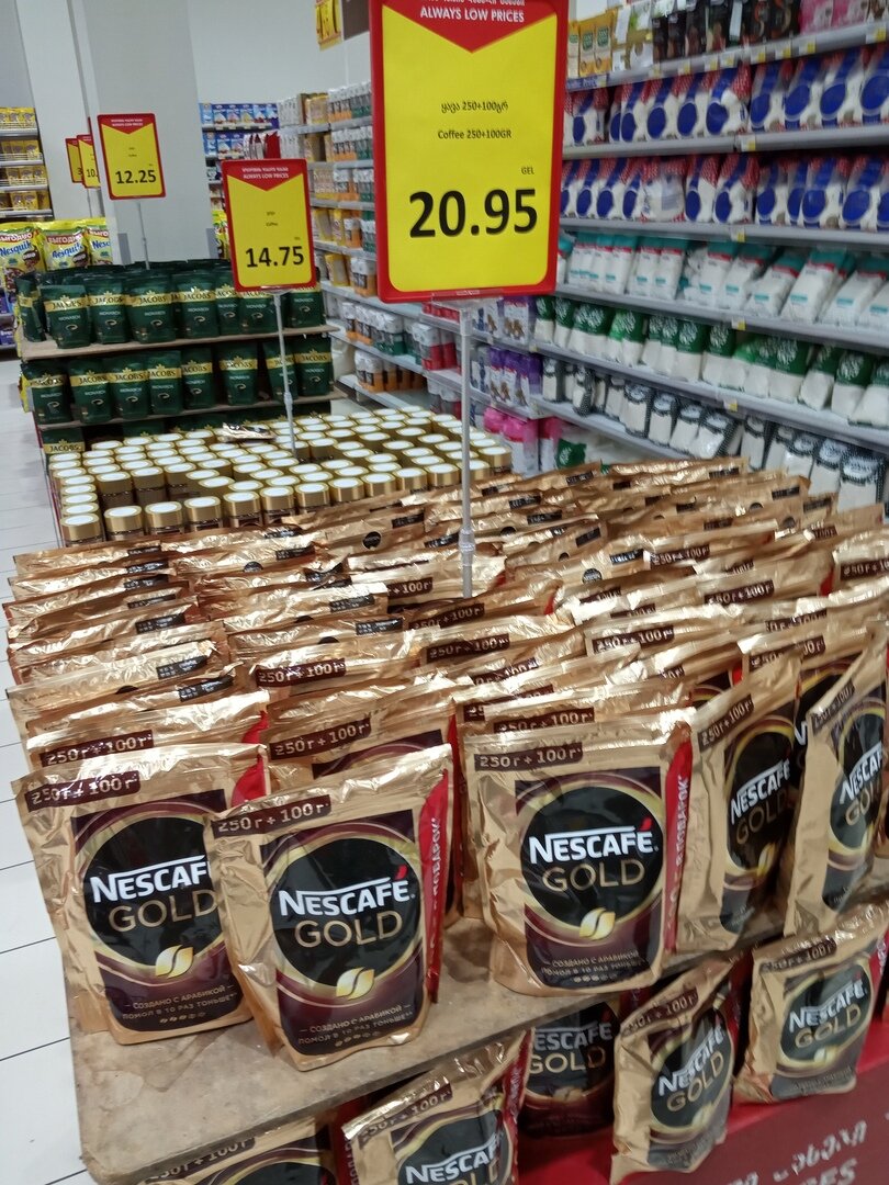 Давно хотел сделать что-то подобное, руки дошли только сейчас. Зашёл в один из самых крупных магазинов в Батуми и нафоткал ценников. В этой статье я представлю только фото. Остальные Вы можете посмотреть в видео в конце этой статьи. Вспоминайте, сколько эти товары стоят в Вашей стране. Кофе Нескафе. 350 грамм стоит 460 рублей. Как по мне, так очень дёшево. Причём это не акция, оно всегда там так стоит. Мой любимый товар в Грузии - Боржоми. Стоимость одного литра всего 23 рубля. Пол-литровая бутылка стоит чуть меньше - 21. 50 рублей стоит полуторалитровая бутылка Кока-Колы. Маленькая бутылочка в пол-литра стоит всего 20 рублей. Не знаю, какие цены в остальной Грузии, но в Батуми так. Тут ещё и завод по производству Колы. Хотя Пепси стоит столько же. Всем знакомая соль. Цена в Грузии всего 15 рублей. Правда, я и не помню, сколько она стоила в России, так как вообще соль не употреблял. Вот и масло подъехало. 68 рублей за 0,9. Есть и другие объёмы, и другие цены; их я показал в видео, кото