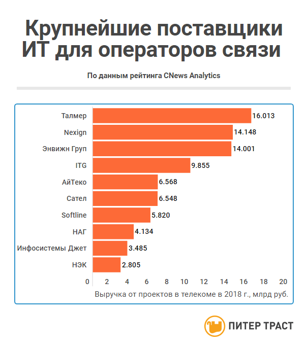 Агентство CNews Analytics представило новый рейтинг крупнейших российских поставщиков ИТ для операторов связи. Согласно представленным данным, по итогам 2018 г. совокупная выручка участников рейтинга (30 компаний, большинство – из Москвы) превысила 100 млрд руб. Таким образом, данный сегмент ИТ-рынка, с 2012 г. находившийся в состоянии падения и стагнации, впервые за долгое время показал уверенный рост.