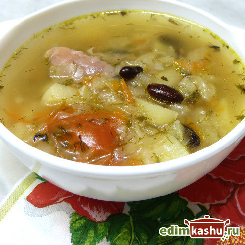 В Болгарии ежегодно проводится фестиваль фасоли, с кулинарной выставкой и церемонией выстрела из фасолевой пушки. В этой статье представлен рецепт очень вкусных Щей на курином бульоне со свежей капустой и фасолью. Для этого блюда необходимы: красная фасоль, свежая капуста, лук, морковь, картофель, зелень и пряности по вкусу. Ингредиенты: