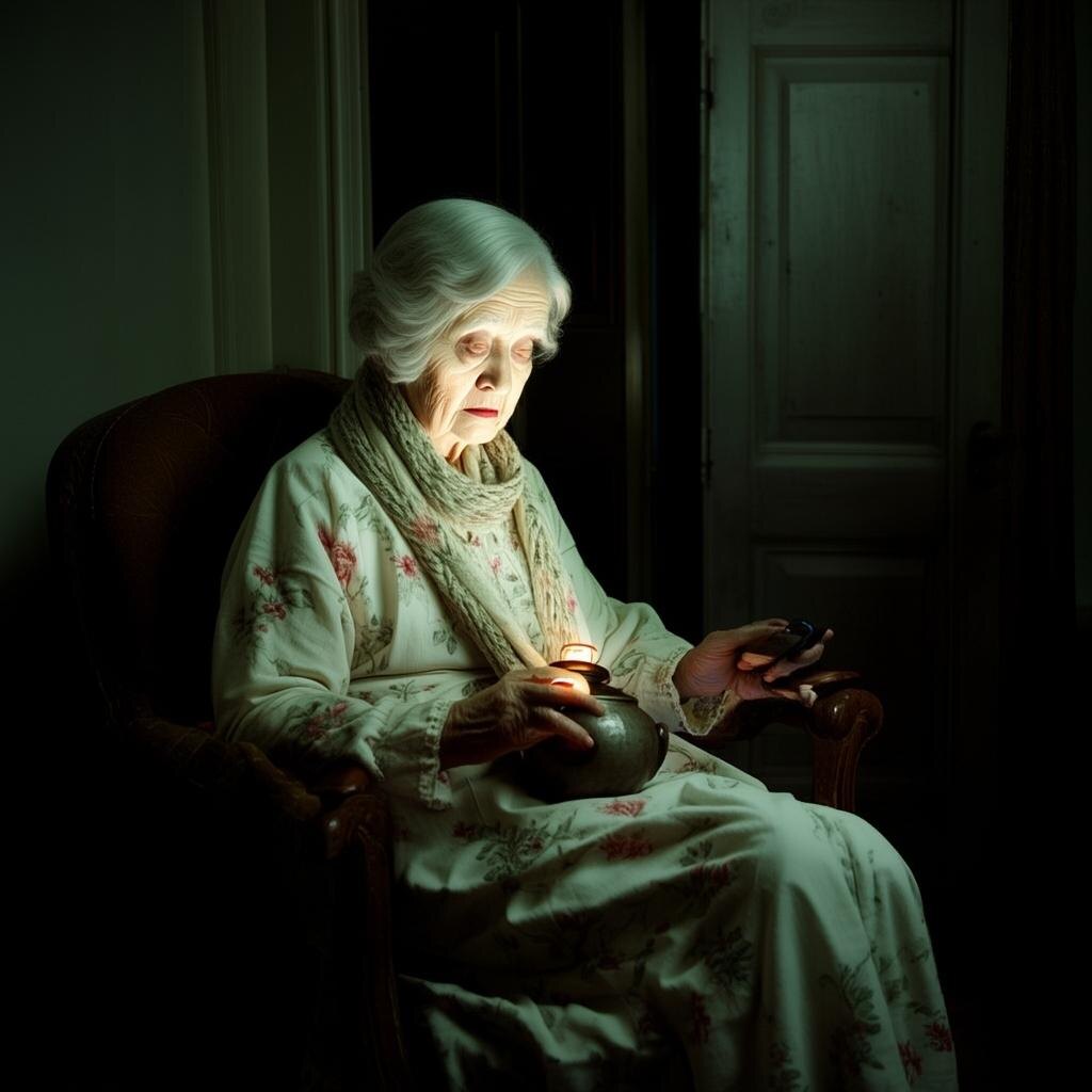 Сердце пропустило удар, а потом забилось где-то в горле. Там, в моем кресле, сложив руки на коленях, сидела та самая бабушка. В руках она держала большую эмалированную кастрюлю, закрытую крышкой. Ее глаза в свете фонарика блестели, как у кошки. И она улыбалась.
