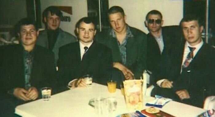 Члены ОПГ Виктор Комахин (второй слева; застрелен в 1995 году) и Игорь Чернаков (третий слева; был убит в 1994 году на следующий день после убийства лидера ОПГ Сильвестра)...