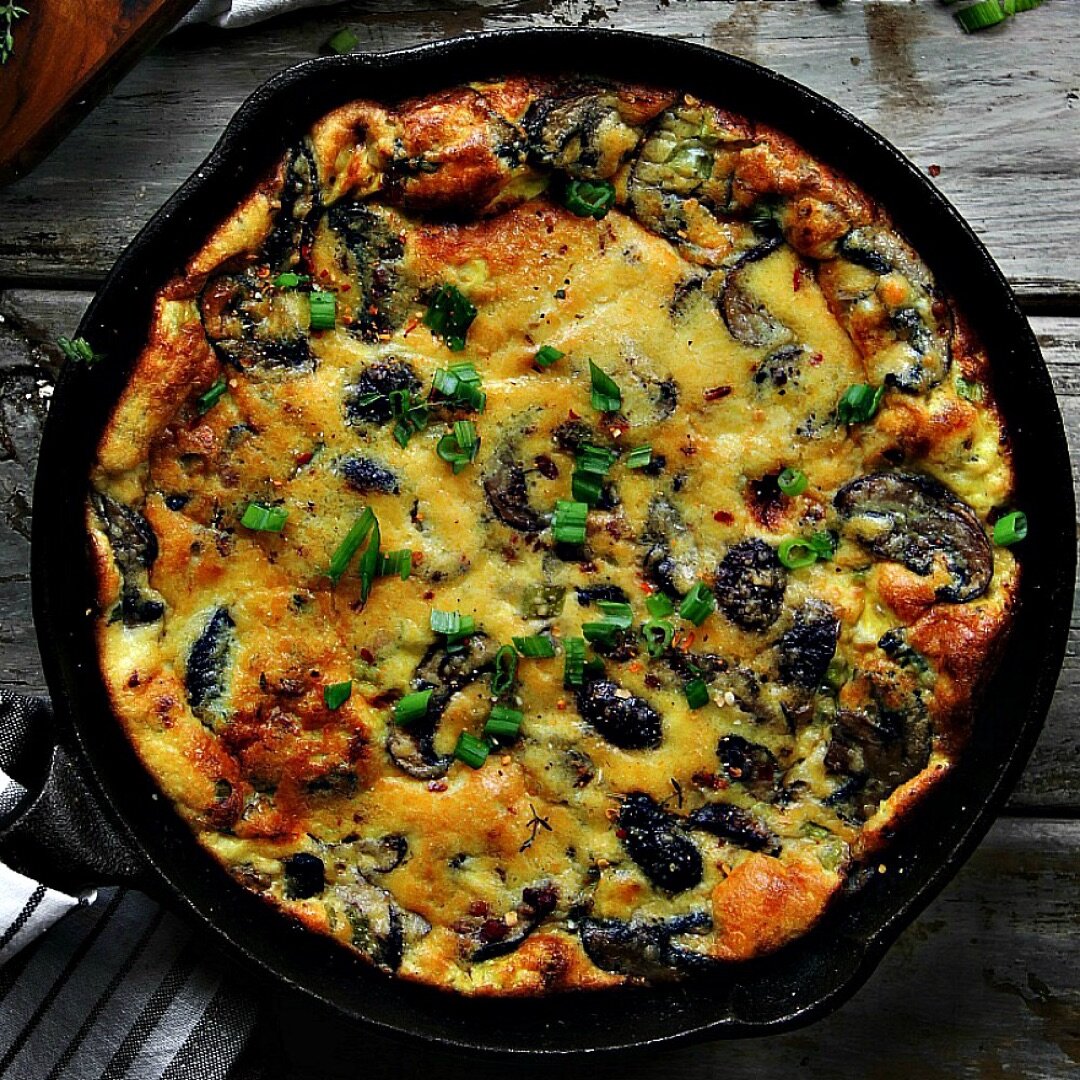 Ароматная, вкусная и универсальная фриттата: просто идеально подойдет для завтрака, обеда или ужина! Равнодушных не будет! 😋 Количество порций: 4 Время приготовления: 35 мин Ингредиенты: Приготовление: 1. Подготовьте все ингредиенты, промыв их, измельчая и нарезая ломтиками. 2. Разогрейте масло на сковороде. Положите кубики бекона, обжарьте несколько секунд, затем добавьте нарезанные грибы, обжарьте в течение минуты-двух, затем добавьте зеленый лук, тимьян, щепотку соли и чили (можно свежий перчик мелко нарезать, можно использовать молотый). Пусть все готовится на среднем огне около 10 минут. 3. Тем временем смешайте яйца до образованмя пенки. К яйцам добавьте: молоко, щепотку соли, чили, а также тертый сыр пармезан. Всё хорошенько смешать. 4. Поддерживайте средний огонь под сковородой, через 10 минут добавьте смешанные яйца в жареные грибы. Готовьте еще около 3-4 минут. Одновременно разогрейте духовку до 200°C. 5. Когда вы видите что края схватываются, настало время переносить ско
