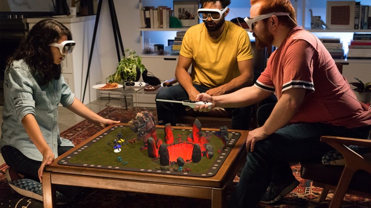 В 2013 году один из бывших инженеров Valve, Джери Эллсворт, предложил идею очков AR и основал компанию под названием Technical Illusions для ее реализации. И хотя поначалу это имело огромный успех, но... ... закончилось как обычно. К счастью, талантливой женщине удалось выкупить свою идею и создать новый бренд под названием Tilt Five. Теперь, после более чем двух лет напряженной работы, команда готова представить миру новую версию этих очков, на этот раз ориентируясь только на настольные игры. Проект пришел на Kickstarter и собрал более 600 тыс., а ведь создатели рассчитывали на 450 тысяч долларов. Таким образом, похоже, что изменения окупились, и люди, которые уже имели возможность протестировать оборудование в действии, гарантируют, что мы говорим об огромном шаге вперед по отношению к castAR. Tilt Five выглядит как пара футуристических очков и весит около 85 грамм, так что игровой процесс с его использованием не слишком утомителен. Вы также можете надеть устройство на свои собствен