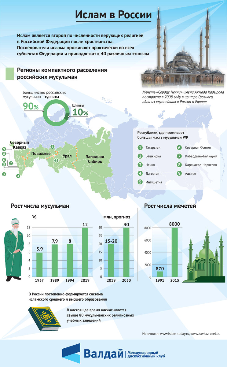 По численности верующих ислам в России стоит на втором месте после христианства. Последователи этой религии живут почти во всех регионах страны и принадлежат к 40 различным этносам. В инфографике, приуроченной к XVI Ежегодному заседанию клуба «Валдай», показываются регионы компактного расселения российских мусульман, рост их числа, а также рост количества мечетей.