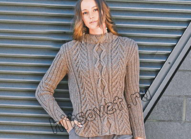 Вязание спицами модного женского свитера с косами и воротником стойка со схемами и бесплатным пошаговым описанием. Вам потребуется: 650 (700, 750) грамм светло-коричневой пряжи, состоящей из 60% натуральной шерсти, 40% полиакрила; длиной нити 90 метров в 50 граммах; спицы № 5; короткие круговые спицы № 5. Описание и схемы