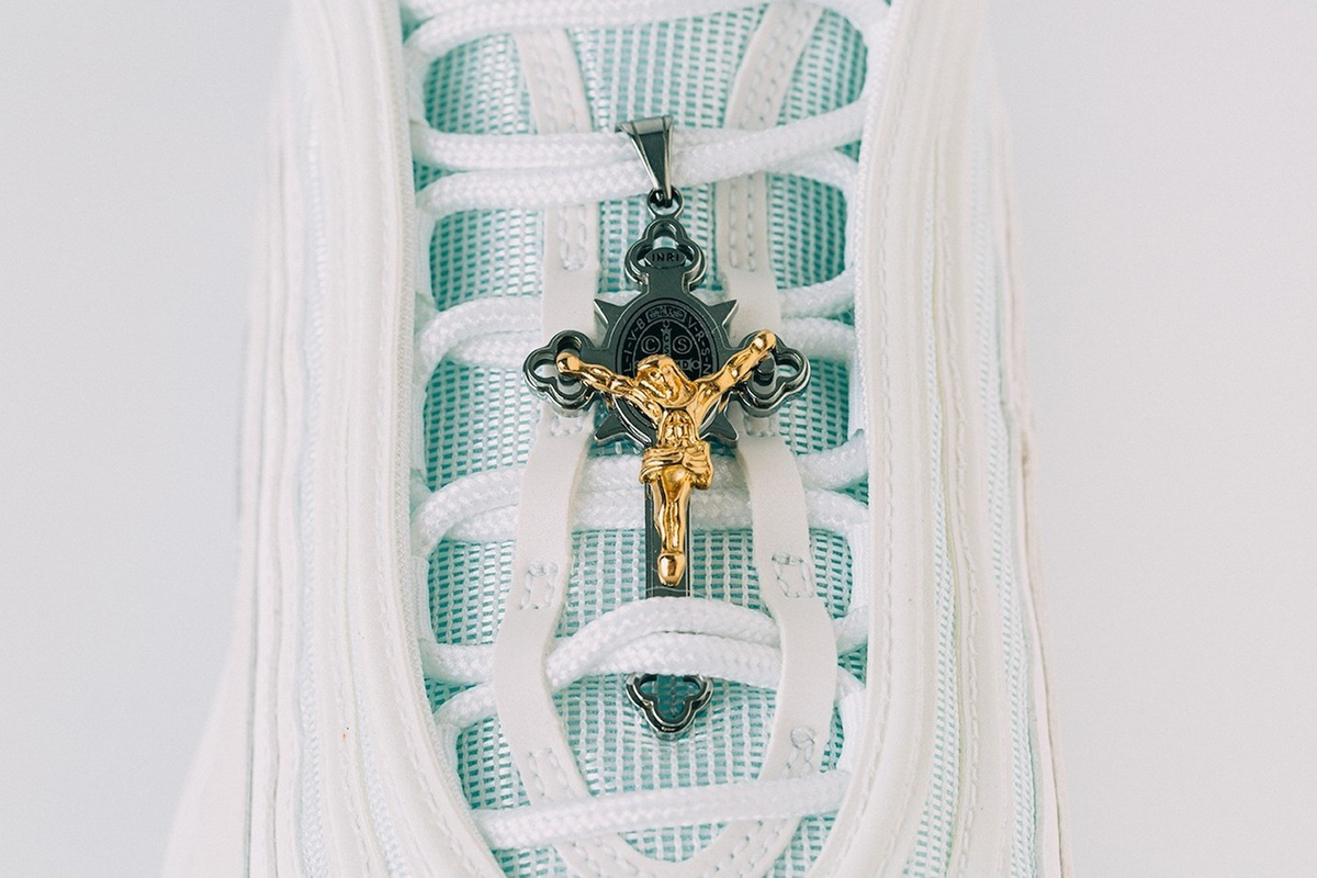 Цена одной пары составила 3 тысячи долларов. Созданием обуви занималась команда дизайнеров MSCHF из Бруклина. По своей сути - это дополненные кроссовки Nike Air Max 97. На кроссовках написаны строки из Евангелии от Матфея о том, как Иисус ходил по воде. В шнурки вставлено распятие, в подошву вкачена святая вода с Иордана. Стелька выполнена в красном цвете, отсылаясь к традиционной обуви Папы Римского. Как высказался один из авторов, таким образом они хотели подчеркнуть абсурдность коллабораций известных людей и различных популярных брендов одежды и обуви. Я сам еврей, но знаю только то, что Иисус ходил по воде. Отсюда и святая вода в подошве Всего было выпущено около 20 пар обуви, как заявили дизайнеры, они собираются продолжит