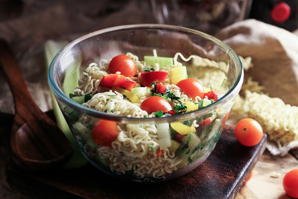 Положите лапшу "Доширак" в широкую миску и высыпьте приправу и сухие овощи из упаковки. Залейте кипятком и подождите три минуты. Полностью слейте воду и дайте лапше остыть. Порежьте свежие овощи на кусочки среднего размера, а черри — пополам. Растопите брусочек сливочного масла 4х4 см, мелко нарежьте зелень и добавьте её в растопленное масло, чтобы дать ей протомиться. Возвращаясь к остывшей лапше, солим её по вкусу. Учтите, что лапша очень сильно впитывает воду, но при этом остаётся практически без вкуса. Добавляем к лапше свежие овощи, добавляем масло с зеленью, всё тщательно перемешиваем и по вкусу добавляем ещё соль/перец или любую другую вашу приправу!