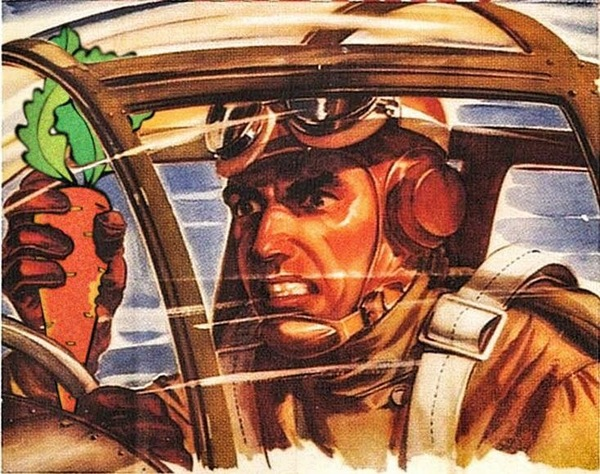 Во время второй Мировой войны в Англии была применена передовая на тот момент система радарного обнаружения самолетов противника, так называемый AI (airborne interception radar). Секретная система засекала бомбардировщики противника еще на их подлете к Ла-Маншу и звенья истребителей поднимались в воздух точно нацеленные на точку соприкосновения с врагом. Английской разведке очень не хотелось, чтобы немцы поняли причину резко возросшей меткости пилотов британских ВВС. После недолгих размышлений выход был найден и в прессе союзников начали активно появляться статьи о экстраординарных способностях некоторых пилотов по нахождению противника в темноте ночи. Одним из таких героев был Джон Каннингем, по прозвищу "Кошачьи глазки". В своих интервью он особенно отмечал, что его суперспособности основаны на особой любви к поеданию морковки. В дальнейшем в прессе появились новые герои-летчики, которые так же любили морковь и видели самолеты немцев ночью, как днем. Эта информация была так убедит