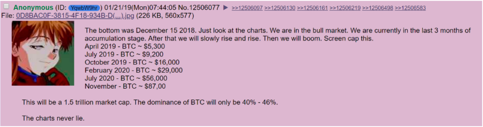 Согласно анонимному пользователю англоязычного имиджборда 4chan, в октябре 2019 цена биткоина должна достичь отметки в $16 000. Неизвестный «предсказатель» сделал такой прогноз ещё в январе: По его словам, биткоин должен был достичь отметки в $5300 в апреле и $9200 в июле. Оба прогноза сбылись. Наряду с октябрьским ценником в $16 000, в феврале 2020 года биткоин должен достичь отметки в $29 000. В следующем июле цена должна вырасти до $56 000, а в ноябре — до $87 000. Анонимный «инсайдер» не дал никаких объяснений относительно того, по каким критериям он прогнозировал эту траекторию цены биткоина. «В настоящее время мы наблюдаем последние 3 месяца стадии накопления», — написал он в январе. «После этого мы будем медленно подниматься. Потом будет “бум”». Однако, несмотря на два удачных прогноза, цена биткоина в $8300 в начале месяца и текущие настроения на рынке не предрасполагают к бычьему забегу, поэтому удвоение текущей цены представляется маловероятным. Тем не менее, аналитики Bin