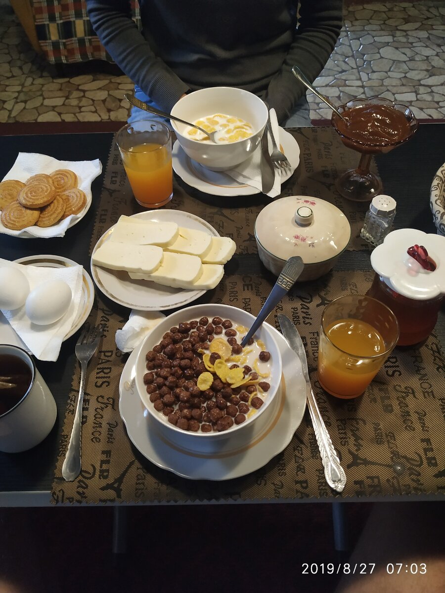 Проснувшись ближе к 8 утра,нас уже ждал завтрак,включенный в стоимость проживания в гостевом доме. Впечатления от завтрака самые приятные. Для нас, например,было удивительно увидеть такие куски сыра. Поверьте,у нас так давно не режут. Так что плотно покушав,собрав вещи,мы отправились дальше. Но первоначально заехали на рынок в Телави и подключили сим-карту. Мы уже были третий день в Грузии,а все оставались без связи. Первой достопримечательностью к посещению на сегодняшний день был замок Греми. Греми некогда был столицей Кахетинского царства. На его территории находиться каменная церковь Архангелов Михаила и Гавриила,можно зайти полюбоваться полустертыми фресками. Также можно заглянуть в отреставрированный царский дворец. На его территории на первом этаже находиться музей,вход платный. Побродив ещё по руинам замка,винный погреб,к сожалению,оказался закрыт,мы решили отправляться дальше. Следующей точкой нашего маршрута был монастырь Некреси. Находиться недалеко от Греми,так что отправ