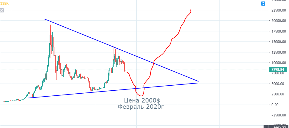 Здравствуйте. С вами CryptoKas. Сегодня я вам расскажу и покажу, что сделают киты с Биткоином. Посмотрите внимательно на глобальный треугольник. Недельный график. На простейшем графике мы видим, что сформировался глобальный клин, который будут пробивать в какую либо стороны. Так как у нас в мае 2000 года халвинг Биткоина, то цену логически будут опускать до нижней линии клина. Цена коснется нижний границы примерно в феврале. Это делается для того, чтобы смогли в рынок войти институционалы со своими миллионами, и закупили Биткоин по низкой цене, на дне. Далее, в мае будет халвинг. И как показывает история Биткоина, взлет цены будет очень сильным, до неопределенных значений. То, что мы пробьем прошлый перехай, в этом не стоит сомневаться.