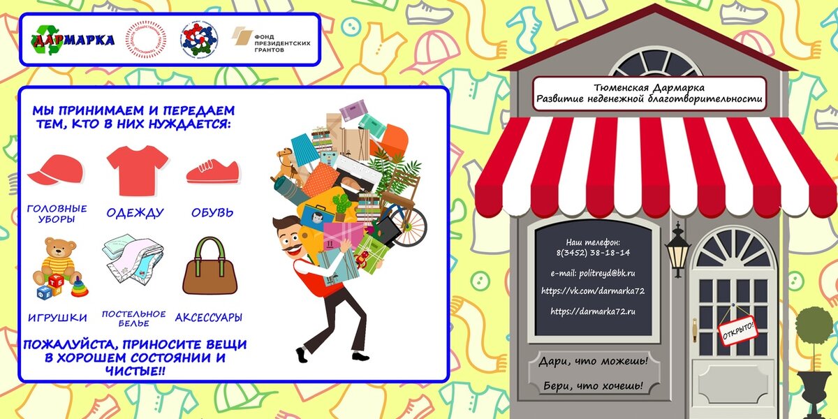 Этой осенью в городе Тюмени при поддержке Фонда Президентских грантов, Департамента социального развития Тюменской области и Общественной палаты Тюменской области стартует реализация социально значимого проекта «Тюменская Дармарка: программа развития неденежной благотворительности».