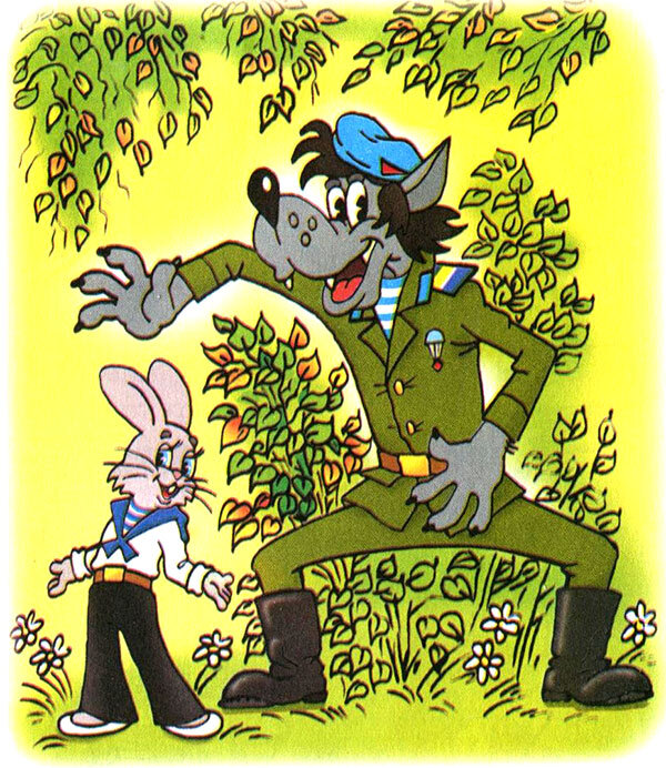 В лесу идёт призыв, встречаются заяц и волк. Заяц говорит: "Был на призывном, служить не хочу, показывали картинки с техникой, чтобы определить, кем служить говорю, что не знаю, показали кирпич, я ответил, ну направили в стройбат. Волк пришёл, сел, на все картинки отвечает "Не знаю" комиссия стала совещаться, что с ним делать. Волк говорит: "У вас в столе кирпич лежит, почему не показываете? Ему в ответ: "Молодец, в разведку пойдёшь." **