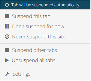 Как известно браузер Google Chrome "жрет" слишком много оперативной памяти. Если вам это мешает при работе, то вы удачно наткнулись на эту статью! В этом нам поможет плагин для браузера "The Great Suspender, the Great POWA". Плагин занимается тем, что приостанавливает (усыпляет) вкладки, подменяя содержимое страницы со вкладкой на пустую, при этом оставляя ссылку на источник. Таким нехитрым образом он существенно снижает расход оперативной памяти компьютера (ибо хранить в памяти пустую страницу со ссылкой гораздо выгоднее, чем всю страницу сайта целиком). Скачать плагин можно отсюда (только для Google Chrome). После установки расширения в правом верхнем углу появится иконка в форме квадратной головы человечка Чтобы опробывать данное расширение в действие, открываем какую-нибудь страницу, жмем на иконку расширения и там появится список действий: В верхнем меню находится строка состояния, где написано что вкладка будет приостановлена, она уже находится в белом списке, вкладка ожи