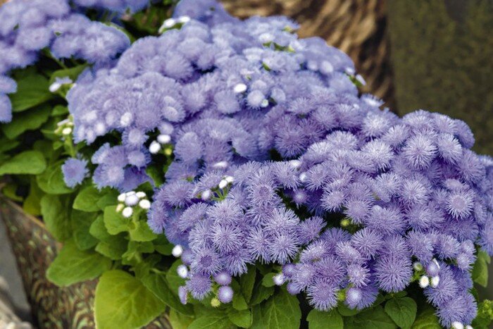 Лучшие компаньоны для агератума с его сине-фиолетовой гаммой — бархатцы и эшшольция желто-оранжево-красных тонов (которые тоже можно посеять под зиму). Эти растения имеют сходные предпочтения и длительный период цветения до самых заморозков. Красивый фон для этих растений создаст серебристолистная цинерария приморская.